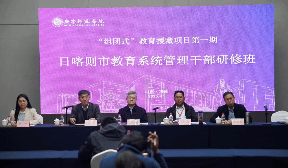 2025年11月11日上午9时,日喀则市教育系统管理干部研修班开班仪式在济南三涧溪灯塔酒店隆重举行。本次研修由齐鲁师范学院承办,来自西藏日喀则市的20名教育系统管理干部齐聚齐鲁大地,开启为期两周的专题研修。仪式由齐鲁师范学院教师教育学院副院长范勇主持,齐鲁师范学院副校长张兆明、日喀则市教育局党组成员、副局长次仁扎西、潍坊市高新区教体局局长李玉良等领导出席,班主任团队及全体学员共同参与。
