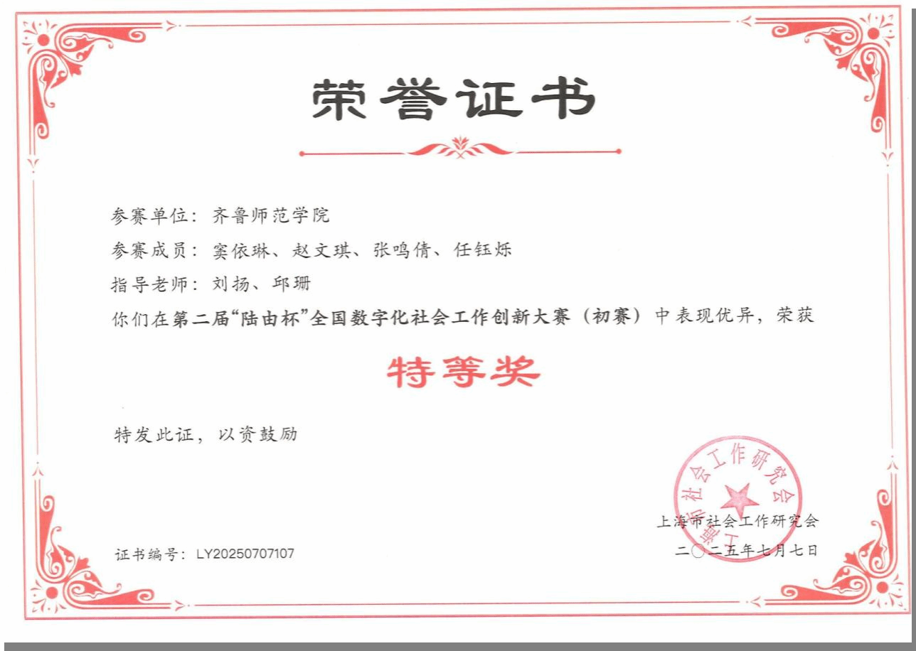 经过初赛、预决赛、决赛的层层角逐,教师教育学院社会工作专业学子窦依琳、赵文琪、张鸣倩、任钰烁组成的“E联泉城社工队”脱颖而出,在决赛中斩获全国一等奖,充分展现了我院学子在数字化社会工作领域的扎实专业功底与创新实践能力,为学校赢得了荣誉。