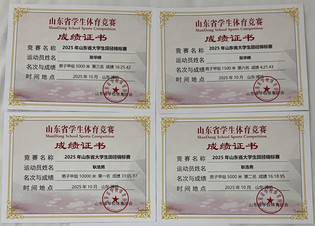 在刚刚结束的2025年山东省大学生田径锦标赛中,学校教师教育学院学生耿浩男、张华峰奋力拼搏、勇创佳绩。其中耿浩男获得男子甲组10000米冠军、5000米亚军,张华峰获得男子甲组5000米铜牌。耿浩男被赛会评选为“优秀运动员”。