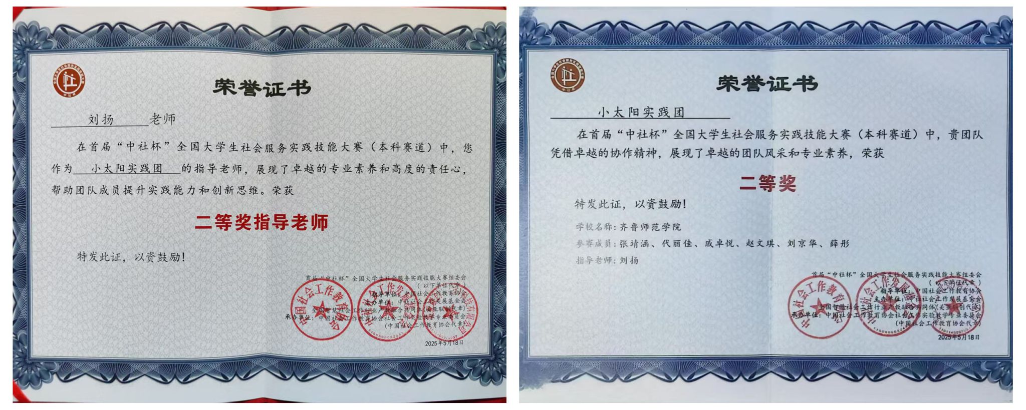 近日,首届“中社杯”全国大学生社会服务实践技能大赛决赛在北京圆满收官。本次大赛由中国社会工作教育协会指导,中社社会工作发展基金会等权威机构联合主办,吸引全国263所高校的763支队伍同场竞技。经过激烈角逐,我院社会工作专业学生张靖涵、薛彤、刘京华、赵文琪、代丽佳,以及小学教育专业戚卓悦组成的“小太阳实践团”,在本科赛道脱颖而出,以第13名的佳绩荣获全国二等奖,彰显了师院学子的卓越风采与专业实力!