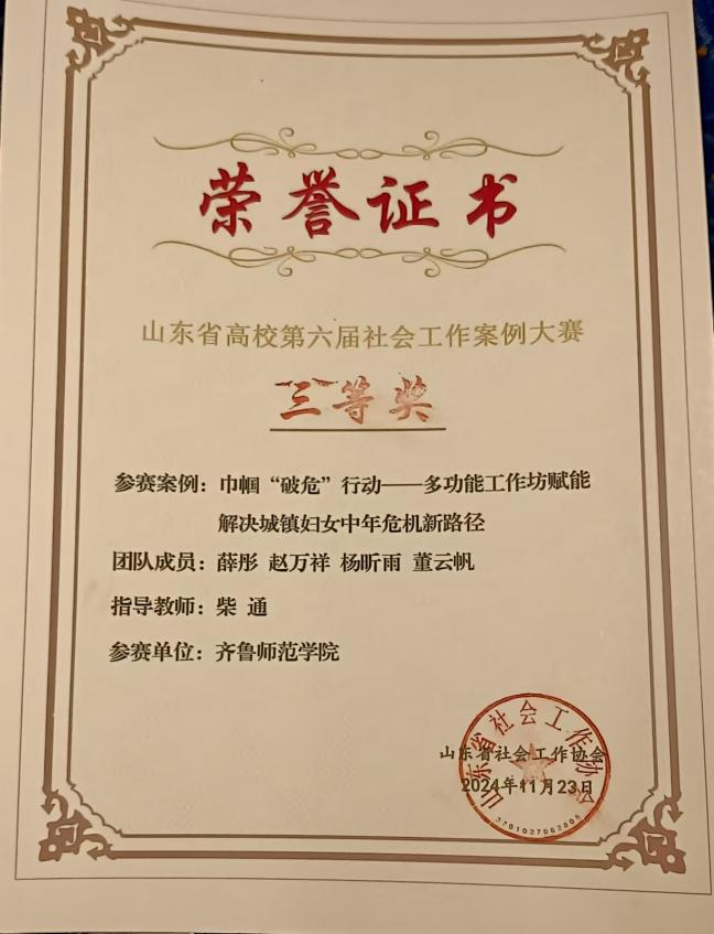 11月23日,第六届山东省社会工作案例大赛圆满落下帷幕。在这场汇聚了山东大学、山东建筑大学、山东青年政治学院等省内22所高校精英的激烈角逐中,教师教育学院社会工作专业的学子们凭借出色的表现和卓越的创新能力,首次参赛便一举夺得了三等奖的殊荣,为学院赢得了宝贵的荣誉。