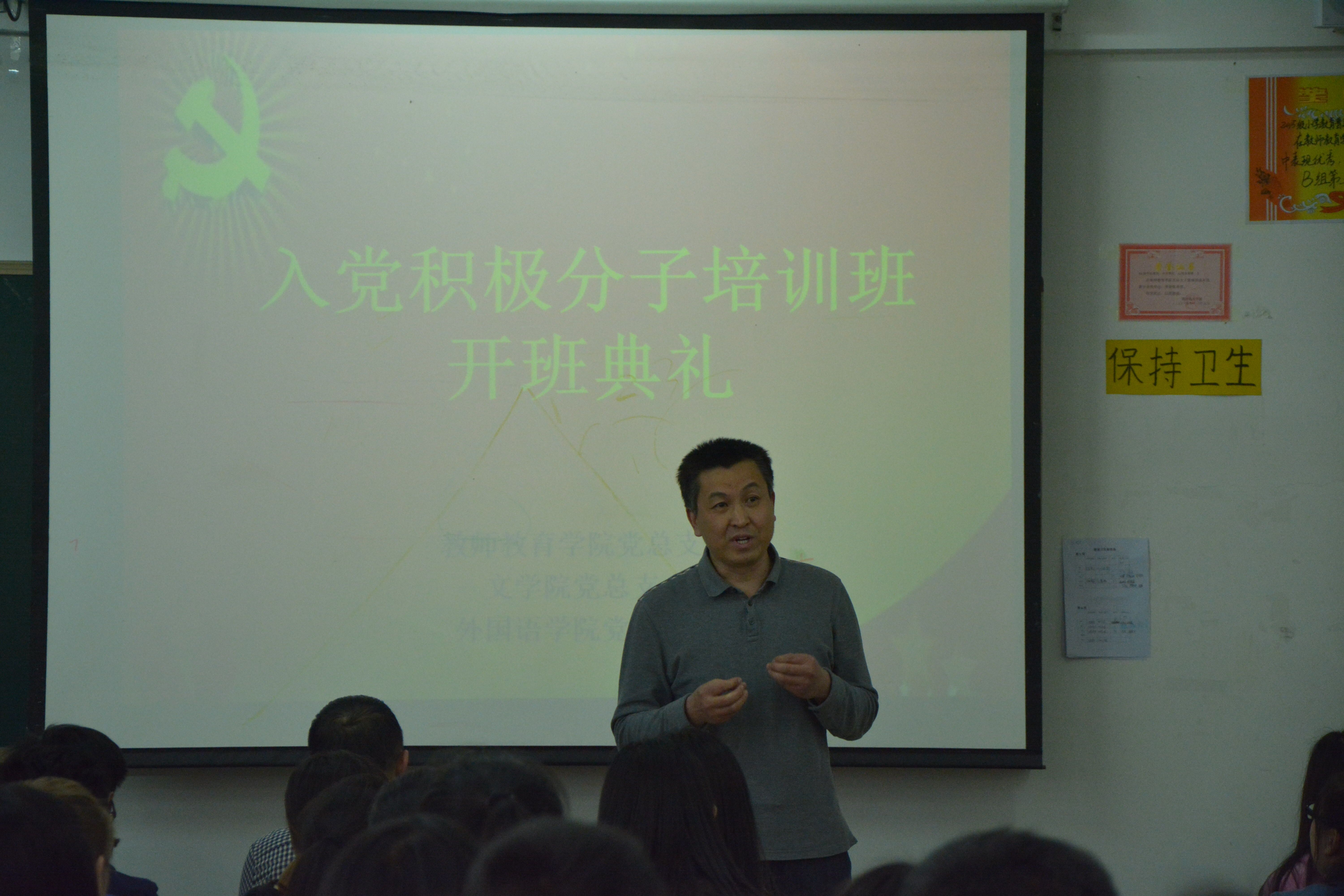 教师教育学院党总支书记陈宝金做动员讲话并就培训班学习提出要求。他指出,入党积极分子培训是认真贯彻中组部关于发展党员工作细则的要求,是发展党员工作过程中的重要内容,是提高入党积极分子思想政治水平和理论水平的重要途径。他还指出,无论党的理论发展,还是从党的革命、建设实践,历史都证明了我们党是一个伟大、光荣、正确的党,很高兴能够看到众多优秀的青年积极向党组织靠拢。此次培训班内容充实、时间紧凑,希望同学们珍惜本次学习机会,端正态度,严肃对待,严明课堂纪律,按照培训班安排,认真学习党史、党章、党规以及党的十八大、三中、四中、五中全会和习近平系列讲话精神,努力做到不落下每一节课,从思想上向党组织进一步靠拢。最后他祝愿所有入党积极分子都能够学有所获,在政治思想水平上有一个大的提升。