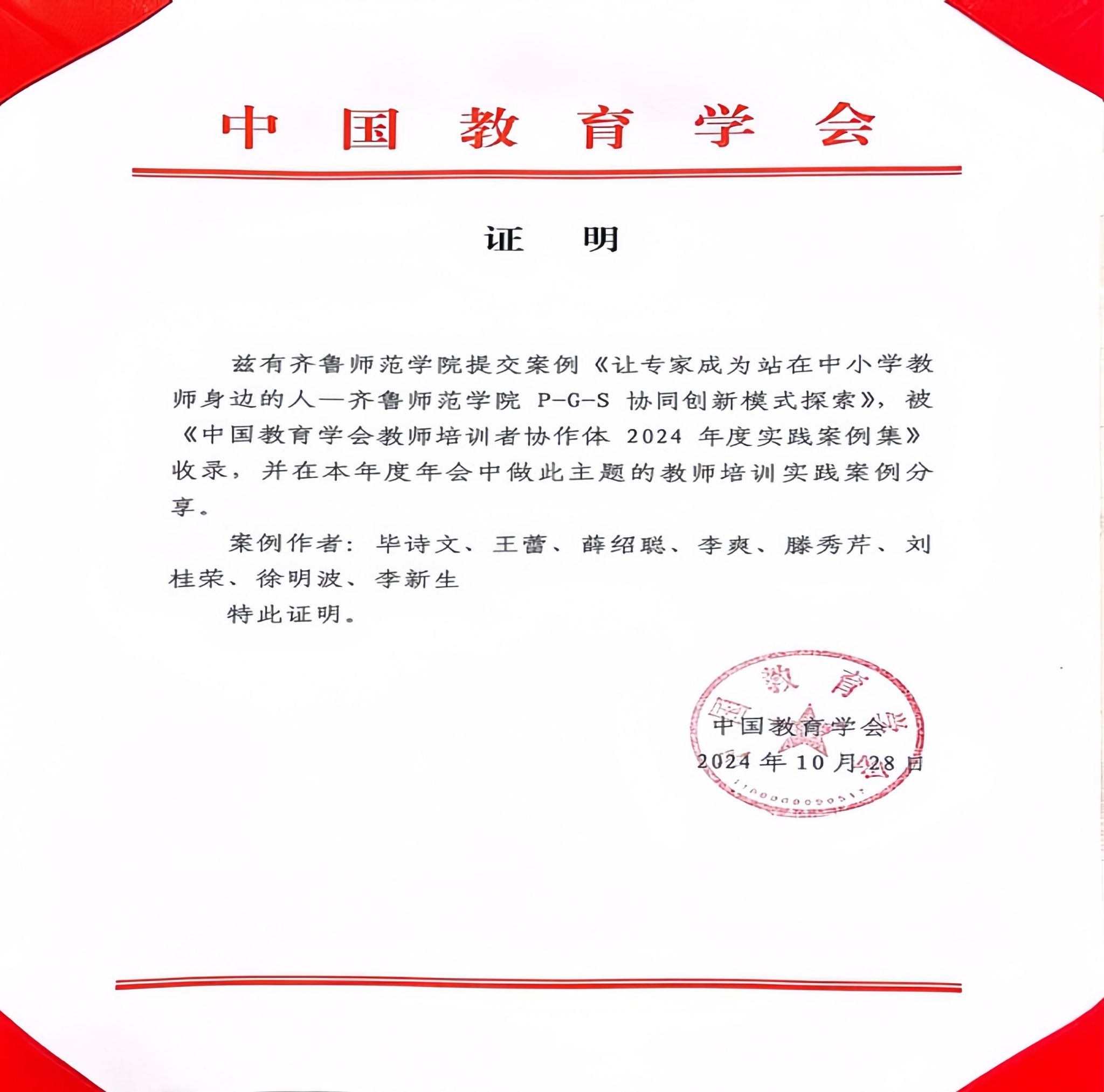 近期,中国教育学会教师培训者协作体举行年度优秀案例征集,经专家遴选,齐鲁师范学院教师教育学院报送的《让专家成为站在中小学教师身边的人——齐鲁师范学院P-G-S协同创新模式探索》成功入选中国教育学会教师培训者协作体2024年优秀实践案例,并应邀在学术年会论坛中进行典型案例分享。