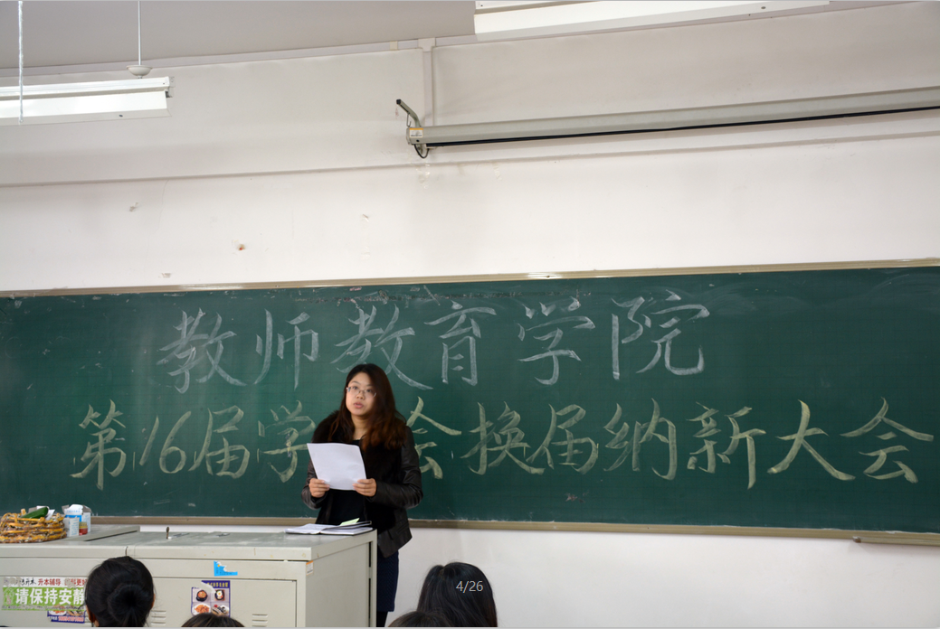 会上,王戈弋老师宣读教师教育学院第16届学生会全体成员名单。随后,由第15届学生会主席王瑞做工作总结,并对新一届学生会给予了很高期望。我院党总支副书记赵青 、团总支书记孙建凯、辅导员王戈弋为第15届学生会代表颁发聘书。新任学生会主席刘冰洁发表任职讲话,她表示愿意与新一届学生会成员为学生会的建设共同努力。