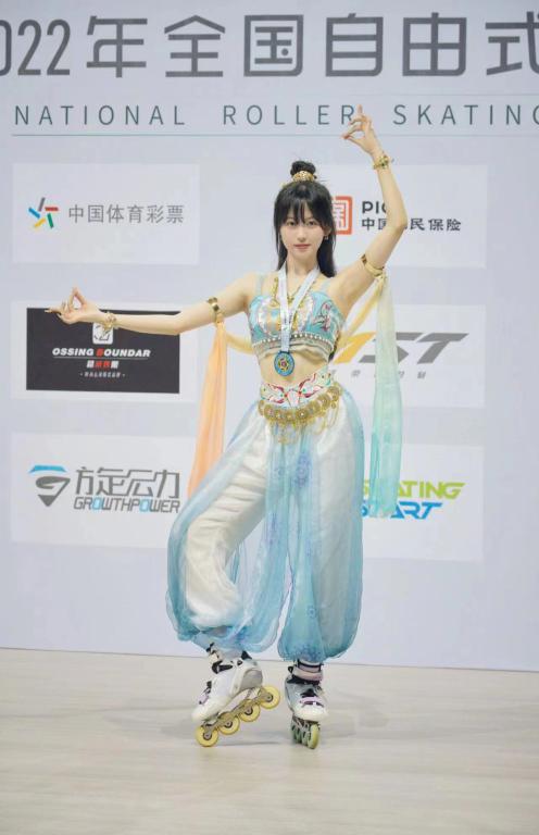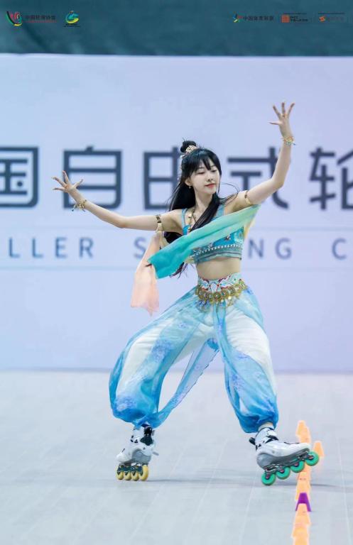 本届全国轮滑锦标赛共设10个轮滑项目,吸引了全国31个省(区、市)、香港、澳门特别行政区4000余人参赛。秦雨晴身披敦煌彩衣,将舞蹈和轮滑与汉服等中华传统文化融入轮滑,将时尚元素和国风艺术相融合,形成独特的国风轮滑,充分展示出轮滑运动“青春、活力”的多元化属性。